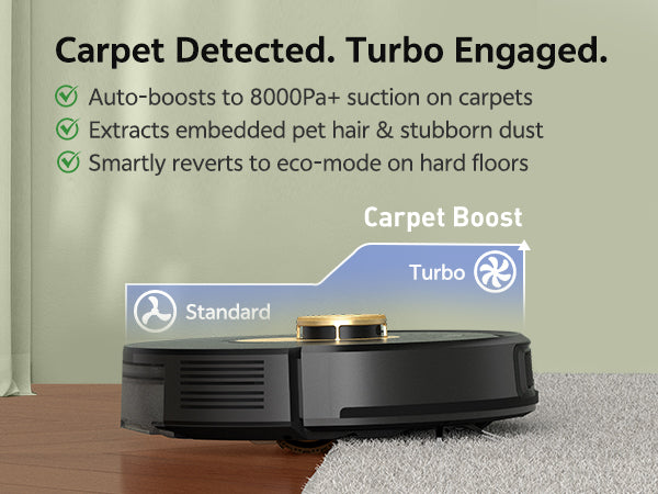 On carpets, it automatically starts the turbine and switches to 8000Pa+ suction mode to remove embedded stubborn dust; on hard floors, it intelligently switches back to energy-saving mode.